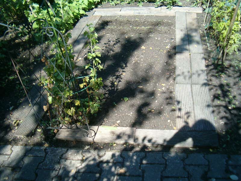 Hier stand früher mal, bei einem meiner Vorgänger, ein Gewächshaus. Irgend ein Vorpächter hat das Beet mit Bretterresten abgedeckt. Ich habe es einfach "Tanzfläche" genannt °lach. . |