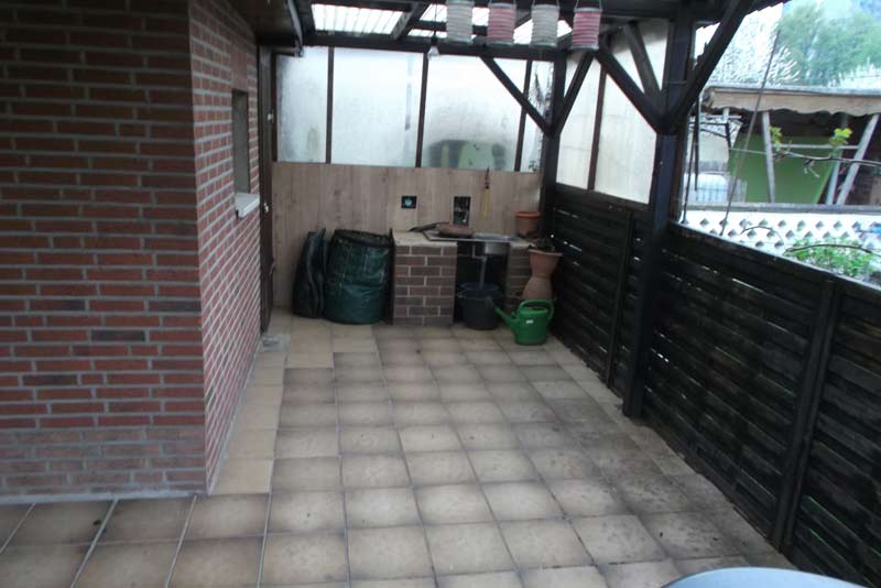 Die Terrasse mit 2 Grünzeugsäcken. |